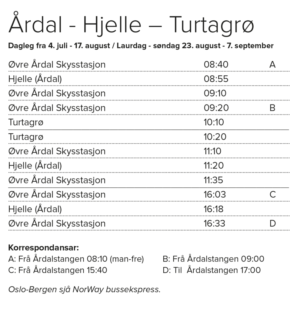 Dagleg fra 4. juli – 17. august / Laurdag – søndag 23. august – 7. september